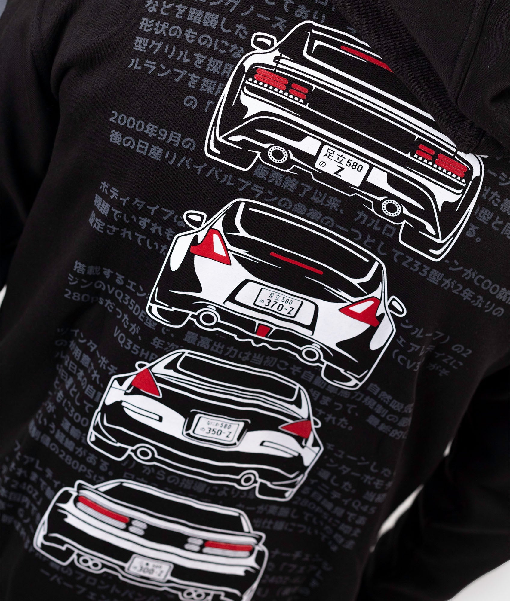 The Nissan Fairlady Z has been the iconic FR Sports car of the Nissan Stable throughout history.. Printed on a high quality, tailored hoodie. It features the 300zx, 350z, 370z & 400z and includes the history of the car in Japanese on the rear.