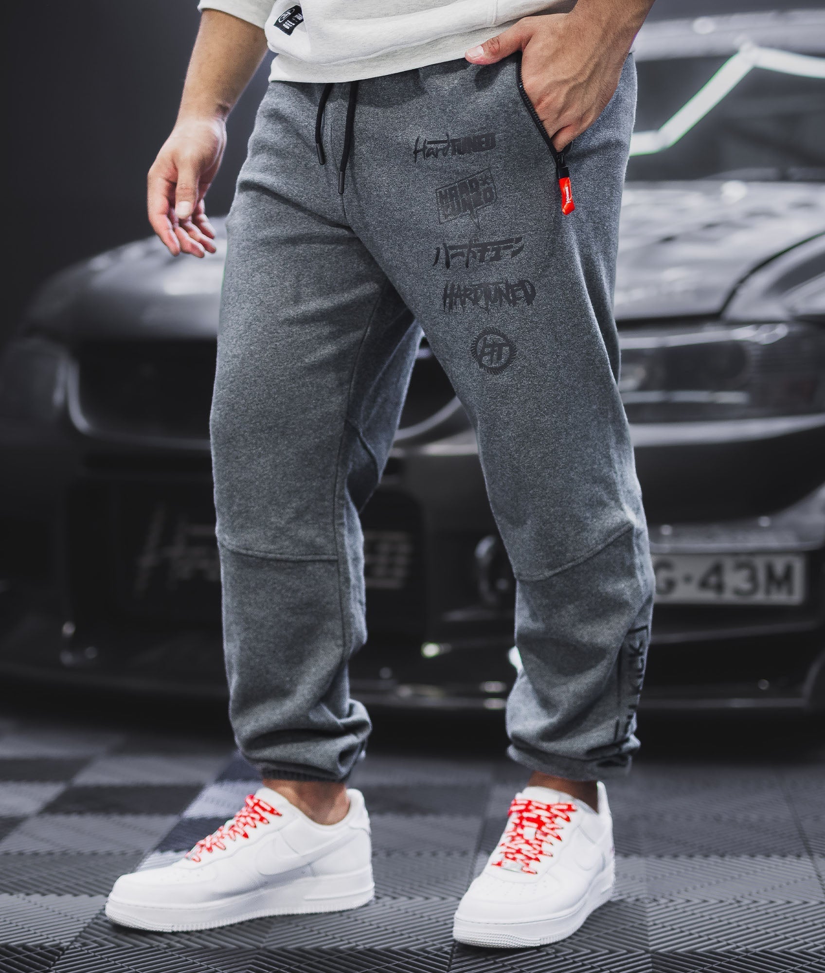 The Charcoal Clutch Kick Trackies feature bold printing all over, including Hardtuned front logos, and "clutch kick" / "power over" on each leg.